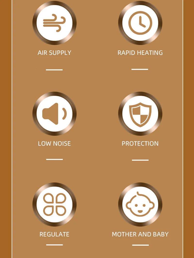 5. Low Noise Operation:This warm air blower features a pure copper motor and utilizes a centrifugal negative pressure airflow system, ensuring quiet operation. It is perfect for indoor spaces such as offices, homes, bedrooms, living rooms, and study rooms, so you can work and rest without disruption.